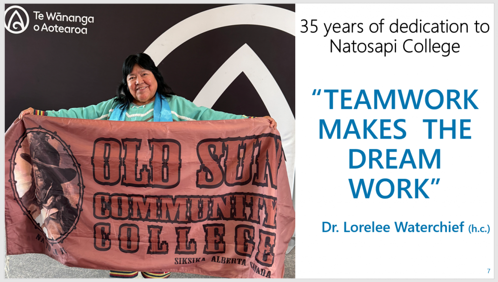 Natosapi (Old Sun) Community College is proud to honour Dr. Lorelee Waterchief, who received an Honorary Doctorate on November 13 in Auckland, New Zealand, from the World Indigenous Nations University (WINU). This prestigious recognition celebrates her lifelong dedication to Indigenous education, community leadership, student advocacy, and the advancement of culturally grounded post-secondary programming. We are deeply honoured to have Dr. Lorelee as one of our senior leadership advisors, guiding our Adult Education and Post-Secondary Programs with integrity, compassion, and wisdom.